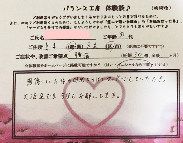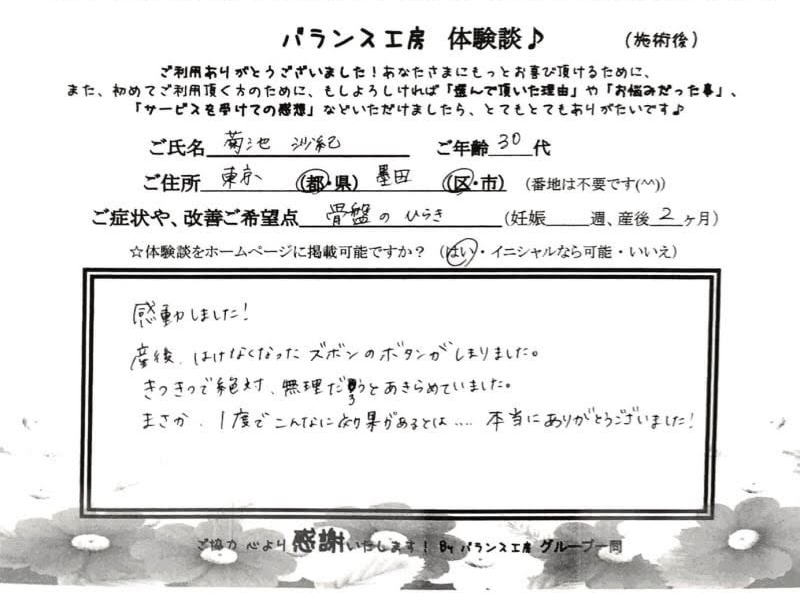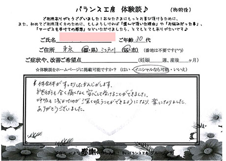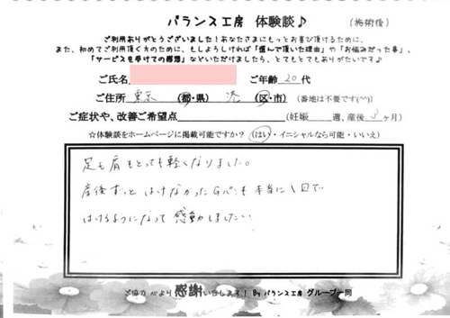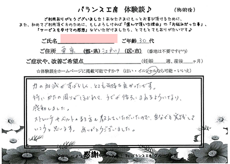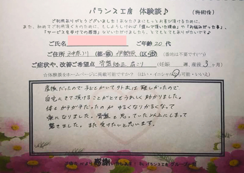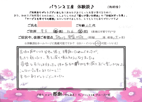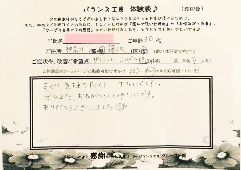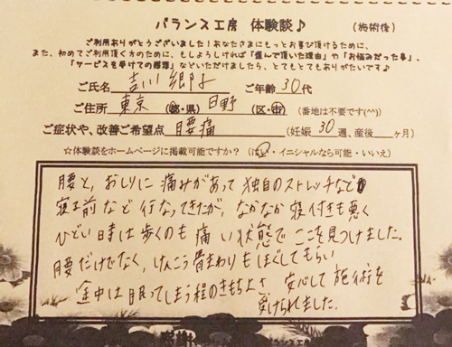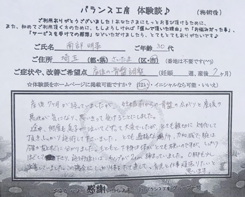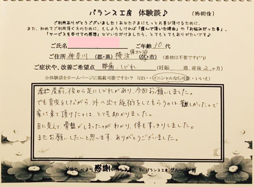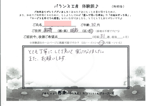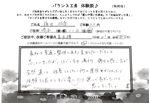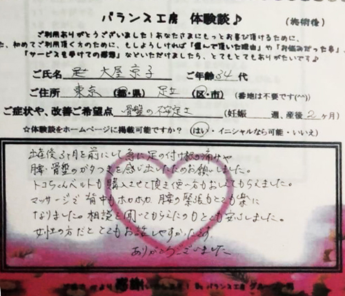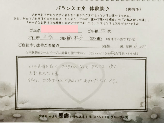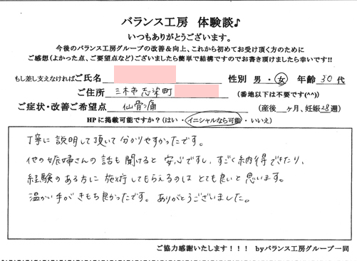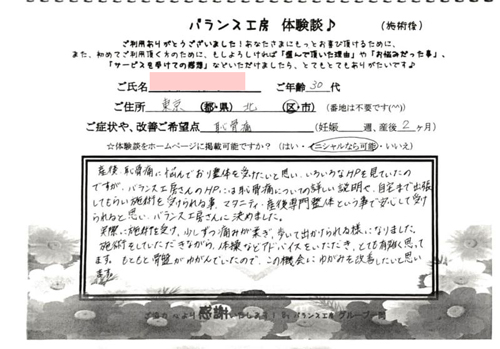 産後、恥骨痛に悩んでおり整体をうけたいと思い、いろいろなHPを見ていたのですが、バランス工房さんのHPには恥骨痛についての詳しい説明や、自宅まで出張してもらい施術を受けられる事、マタニティ・産後専門整体ということで安心して受けられると思い、バランス工房さんに決めました。