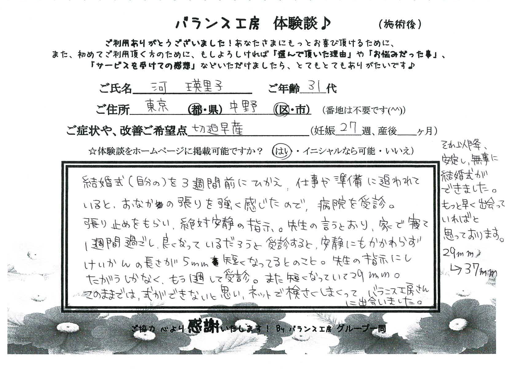 | 昨日は、とっても長い時間丁寧に施術いただき ありがとうございました。 母と二人で、先生が帰られたあとも「よかったね〜、すごいね〜」などと 盛り上がっておりました。 大満足だったので、感動を忘れないうちにメールさせていただきます。 妊娠後期に切迫早産で入院になり、その原因が骨盤の緩みからきていると知り、産後は絶対に骨盤矯正をしなくては!と思っていました。 産後は自分でも違和感を感じるほど、骨盤がグラグラし動くたびにギシギシいっているような感じでした。 産後1週間ほどから恥骨と尾骨に痛みが走り、お通じのたびに骨が開いていくような感覚に悩まされました。 いくつも骨盤矯正のお店のサイトを見ましたが、一番効果がありそう!と 直感したバランス工房さんにお願いすることに。 決め手は患者からの視点に基づいたHPづくりでした。不安なことがすべて 説明されていて信頼できると感じたのです。 施術はとても丁寧で、力加減を確認してくれますし、「痛いのを我慢しないように」 と仰り終始気持ちいい加減でマッサージしていただきました。 強く押したわけではないのに、みるみる肩や首のコリがほぐれたのは驚きです。 目的の骨盤矯正は恥骨、尾骨の痛みを解消したあとにしていただきましたが、骨がスーッと中に入っていく感じが体感できました。 施術前とは、あきらかにベルトの締まる位置が変わっていたのですが 産後お尻から腰にかけて入らなかったウールのパンツ(伸縮性なし)が閉まるようになったのでさらに感動しました! 教わった体操を続けて、これからもっと骨盤を締めていきたいと思います。 次回もよろしくお願いします。 山田 ●●● |