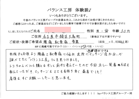 妊娠8ヶ月頃より腰痛と恥骨痛に悩み、近所に妊婦ができるマッサージ店がないか調べていたら「バランス工房」さんを見つけました。