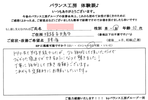 バランス工房さんに来て頂いて骨盤の矯正とあとトコちゃんベルトを巻いて頂いたんですけれども、だいぶ楽になりました。