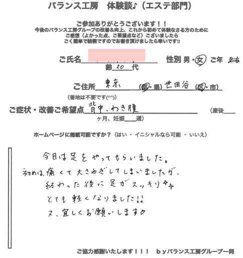 | 先日は、ありがとうございました。 産後太りを解消したくエステに行きたい気持ちと、 予約したものの、 セルライトエステは痛過ぎるイメージでしたが、 エステの技術もとても上手で、終わった後は太ももの間に久しぶりの隙間が!! そしてお尻も上がって小さくなってる!! 細さだけじゃなく、足が軽くなったのにも感激でした。 更に嬉しい事に、2日後の足は、より細っそりしていました(^ ^) 自分のご褒美にまたお願いしようと思ってます。 |