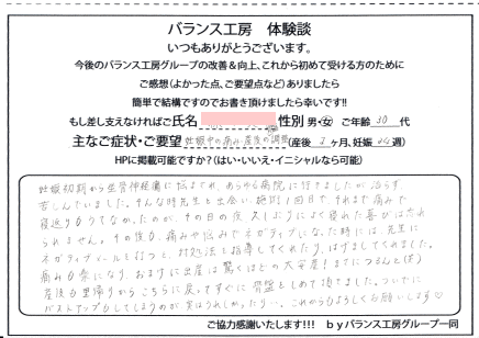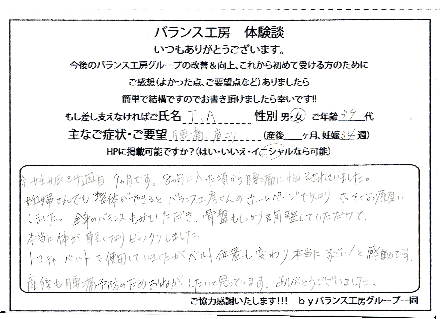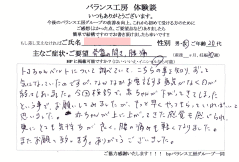 バランス工房さんに来て頂いて骨盤の矯正とあとトコちゃんベルトを巻いて頂いたんですけれども、だいぶ楽になりました。