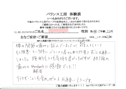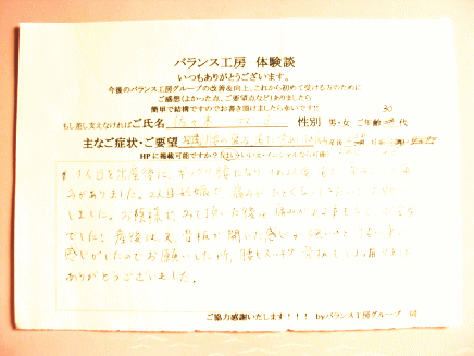 バランス工房さんのHPをみて、整体もやって頂けるということでお願いしました。