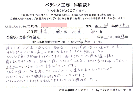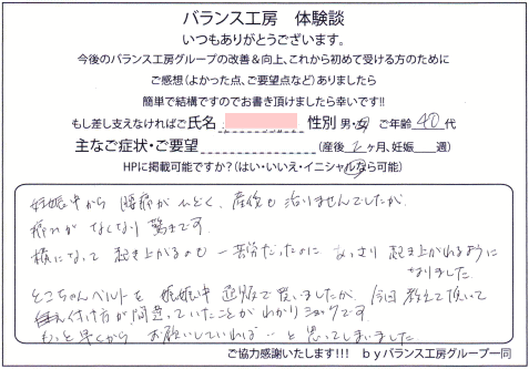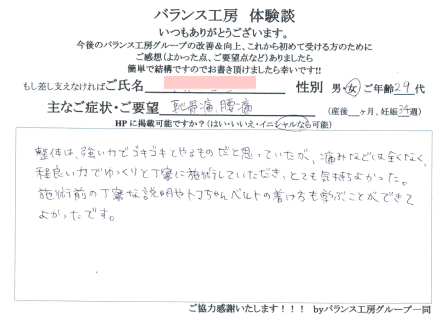 妊娠中より腰痛に、悩まされていましたが、妊婦でも積極的かつ丁寧に