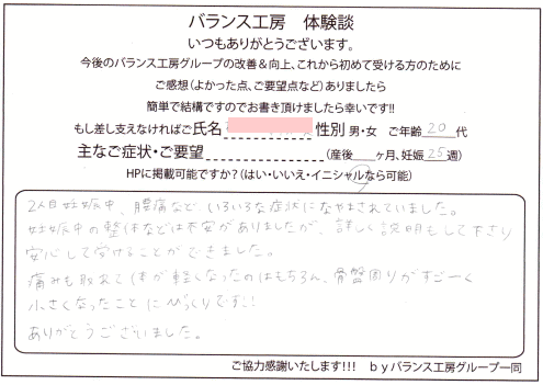 1回目 妊娠24週、2回目 産後14日 腰痛・尾てい骨周辺痛 安産