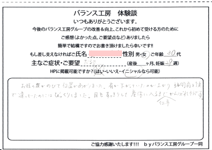 妊娠24週目で、初めてバランス工房さんの骨盤矯正を受けました。