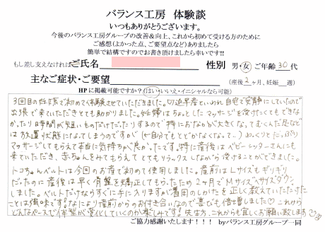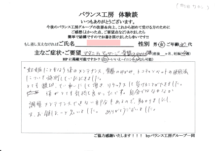 妊娠24週 肩こり 腰痛 足の付け根痛 マタニティ整体 妊娠中(妊婦)整体 口コミ