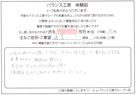 今日は産後で初めて来ていただいんですけれども、産後1回目の施術でおしりがものすごく小さくなりました。