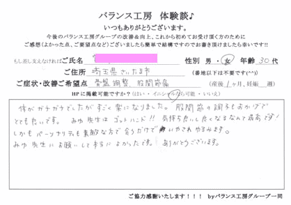 骨盤を押してもらっているときに自分の体じゃないくらいにミシミシと骨盤が(笑)入っていくのを感じてすごい効果を感じています。