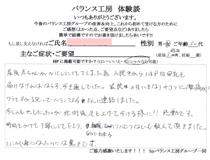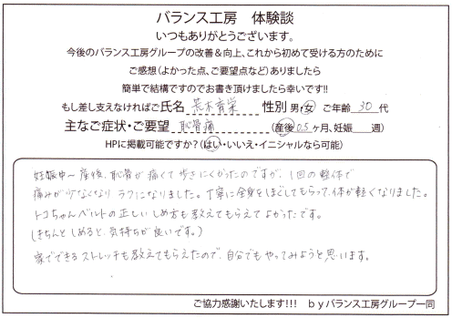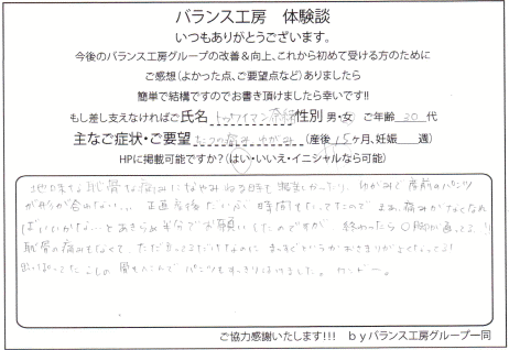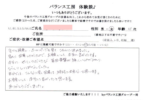 昨日は、とっても長い時間丁寧に施術いただき ありがとうございました。 母と二人で、先生が帰られたあとも「よかったね〜、すごいね〜」などと 盛り上がっておりました。 大満足だったので、感動を忘れないうちにメールさせていただきます。 妊娠後期に切迫早産で入院になり、その原因が骨盤の緩みからきていると知り、産後は絶対に骨盤矯正をしなくては!と思っていました。 産後は自分でも違和感を感じるほど、骨盤がグラグラし動くたびにギシギシいっているような感じでした。 産後1週間ほどから恥骨と尾骨に痛みが走り、お通じのたびに骨が開いていくような感覚に悩まされました。 いくつも骨盤矯正のお店のサイトを見ましたが、一番効果がありそう!と 直感したバランス工房さんにお願いすることに。 決め手は患者からの視点に基づいたHPづくりでした。不安なことがすべて 説明されていて信頼できると感じたのです。 施術はとても丁寧で、力加減を確認してくれますし、「痛いのを我慢しないように」 と仰り終始気持ちいい加減でマッサージしていただきました。 強く押したわけではないのに、みるみる肩や首のコリがほぐれたのは驚きです。 目的の骨盤矯正は恥骨、尾骨の痛みを解消したあとにしていただきましたが、骨がスーッと中に入っていく感じが体感できました。 施術前とは、あきらかにベルトの締まる位置が変わっていたのですが 産後お尻から腰にかけて入らなかったウールのパンツ(伸縮性なし)が閉まるようになったのでさらに感動しました! 教わった体操を続けて、これからもっと骨盤を締めていきたいと思います。 次回もよろしくお願いします。 山田 ●●● |