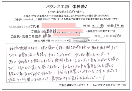 妊娠後期になり、腰の痛み(特に起き上がる時や動き出す時)がひどく、日常生活に支障をきたしていたので、少しでも楽になれば…と思い施術をお願いしました。