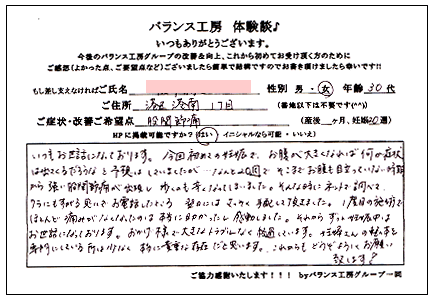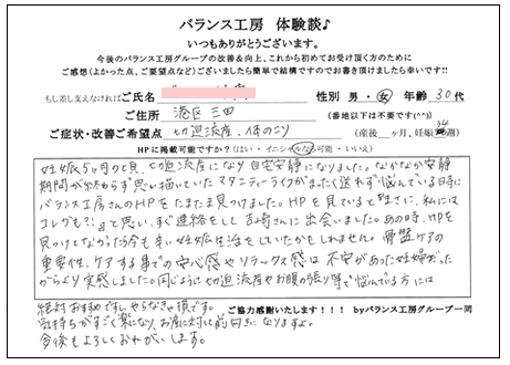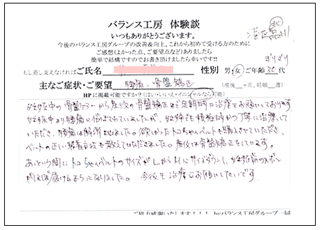 「妊婦での積極的かつ丁寧に施術して頂き腰痛が解消されました」