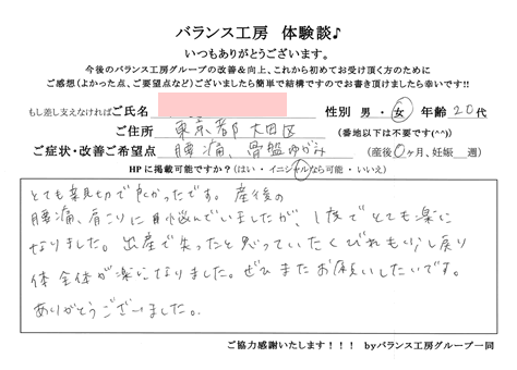 産後0か月 腰痛 骨盤ゆがみ 産後骨盤矯正 整体 東京都 大田区 口コミ