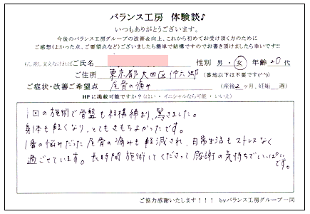 産後の腰痛、肩こりに悩んでいましたが、1度でとても楽になりました。