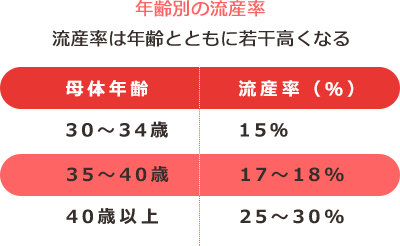 確かに流産率は、30~34歳までは15%、35〜39歳は17%〜18%、40歳以上は25%〜30%と、年齢が高くなるにつれて若干高くなっています。