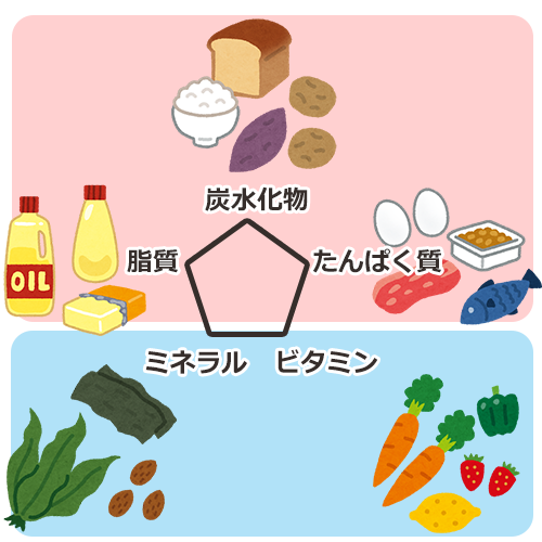 5大栄養素は炭水化物・脂質・たんぱく質・ミネラル・ビタミンの5つです。