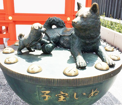 境内にある「子宝いぬ」は周囲を取り巻く十二支のうち自分の干支を撫でると安産、子授け、無事成長などのご利益があるといわれています。