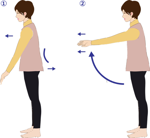 1.両手を楽に下して自然体で立ち、両足を肩幅に開きます。お尻を突き出すようにして腰を反らし、上体を少し前項させます。