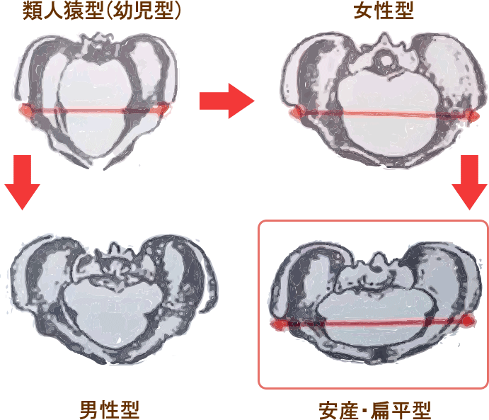 「類人猿型(幼児型)」が成長して「女性型」の骨盤になります。